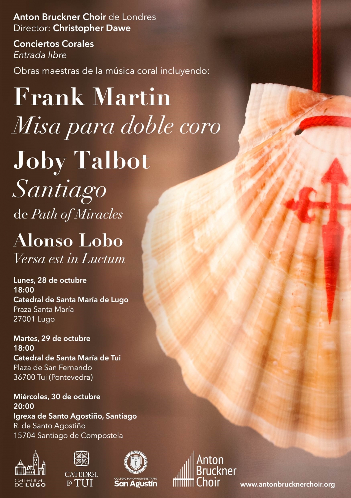 La gira comenzará el lunes 28 de octubre en la *Catedral de Lugo* a las 18:00h, seguida el martes 29 de octubre en la *Catedral de Santa María de Tui* (Pontevedra) a la misma hora. La serie culminará el miércoles 30 de octubre en la *Igrexa de Santo Agostiño* en Santiago de Compostela, con un concierto previsto a las 20:00h. Los asistentes podrán disfrutar de un programa variado que incluye obras destacadas como *‘Santiago’ (Path of Miracles)* de Joby Talbot, la *Misa a Doble Coro* de Frank Martin y *Five Negro Spirituals* de Michael Tippett, entre otras.