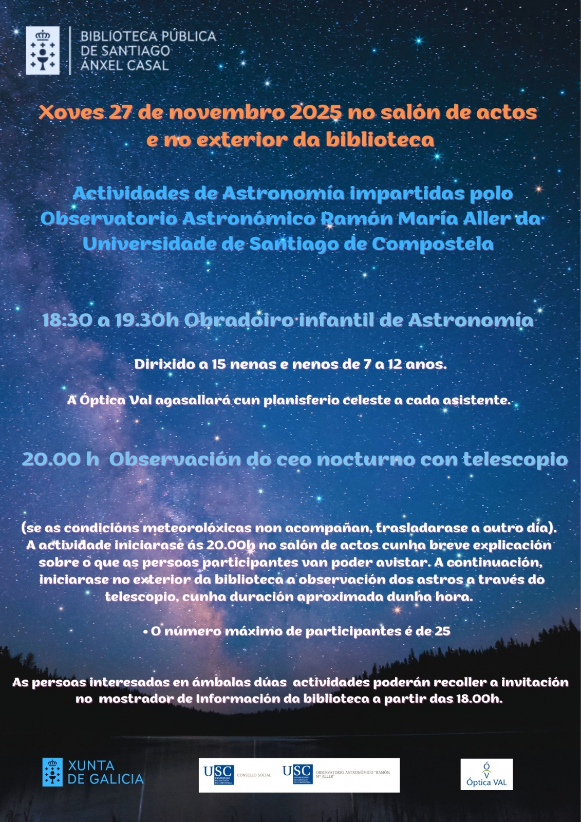Observación del cielo nocturno con telescopio realizado por el Observatorio Astronómico Ramón María Aller de la Universidad de Santiago de Compostela (si las condiciones meteorológicas no acompañan, se trasladará a otro día).
