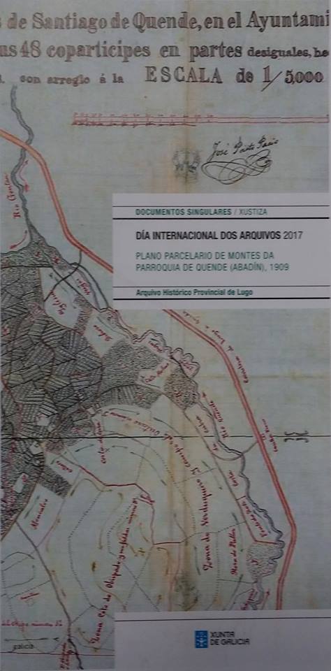 -Presentación de un documento singular de los que custodia. El documento que presentamos en esta ocasión es un juicio de mayor cuantía promovido por José Prieto Pacio contra Francisco Díaz Edrosa sobre el pago de una cantidad de pesetas. El expediente se inicia con la presentación de la partija de los montes de Quende, para a cual el agrimensor elabora unos planos topográficos de gran calidad en los que se aprecia detalladamente el reparto de las distintas clases de zonas entre los 48 copartícipes.