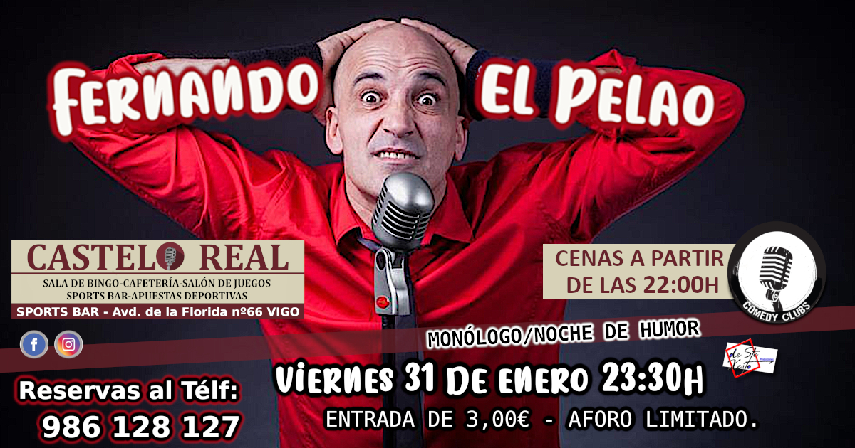Monólogo de El Pelao este mismo viernes 31 de enero en el Sports Bar Castelo Real. Este humorista, residente habitual de La Chocita del Loro de Madrid, nos presentará su monólogo estrella 'Historias de una calva'.