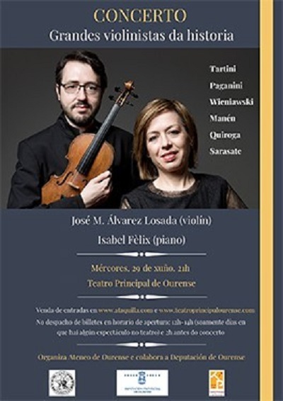 Este concierto está a cargo del violinista José Manuel Álvarez Losada y la pianista Isabel Fèlix, ambos profesores titulares del Conservatorio Superior de las Islas Baleares y con sólidas carreras artísticas, tanto como solistas como intérpretes de música de cámara. El programa está dedicado íntegramente la obras compuestas por grandes violinistas de la historia, desde lo Barroco a los siglos XIX y XX, con la presencia además del tres máximos exponentes de este instrumento en España: Pablo de Sarasate, Joan Manén y Manuel Quiroga. El recital se abrirá con la sonata " Trino de él Diablo" de Giuseppe Tartini, una pieza que el compositor atribuyó a un sueño donde escuchó al diablo tocar una sonata "tan maravillosa y tan hermosa, interpretada con tanto arte e inteligencia, como nunca había pensado ni nos mis más intrépidos sueños".
