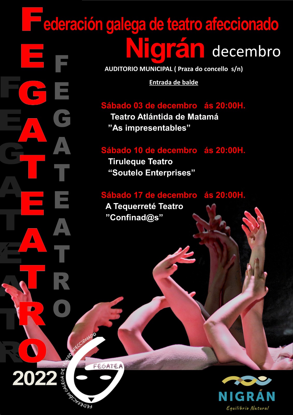 Las impresentables de Atlántida de Matamá a las 20:00 horas en el Auditorio Municipal. Una directora un poco antipática empeñada en sacar adelante una obra después de la pandemia, una becaria que es explotada y un elenco de lo más impresentable. Con intermedios publicitarios y escenas de lo más estrafalarias, Las Impresentables tratará de hacer reír al público asistente. Es una obra de teatro cómica de sketches con piezas de Tomás Afán, Alejandro Jodorowsky, Eugene Ionesco o los Monty Python. La entrada es gratuita hasta completar aforo.