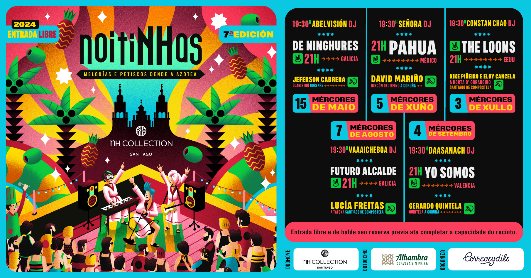 O ciclo gastronómico e musical noitiNHas regresa á programación cultural cunha sétima edición na que ofrecerá cinco eventos de participación gratuíta para o público no NH Collection Santiago os mércores quince de maio, cinco de xuño, tres de xullo, sete de agosto e catro de setembro a partir das 19:30h.