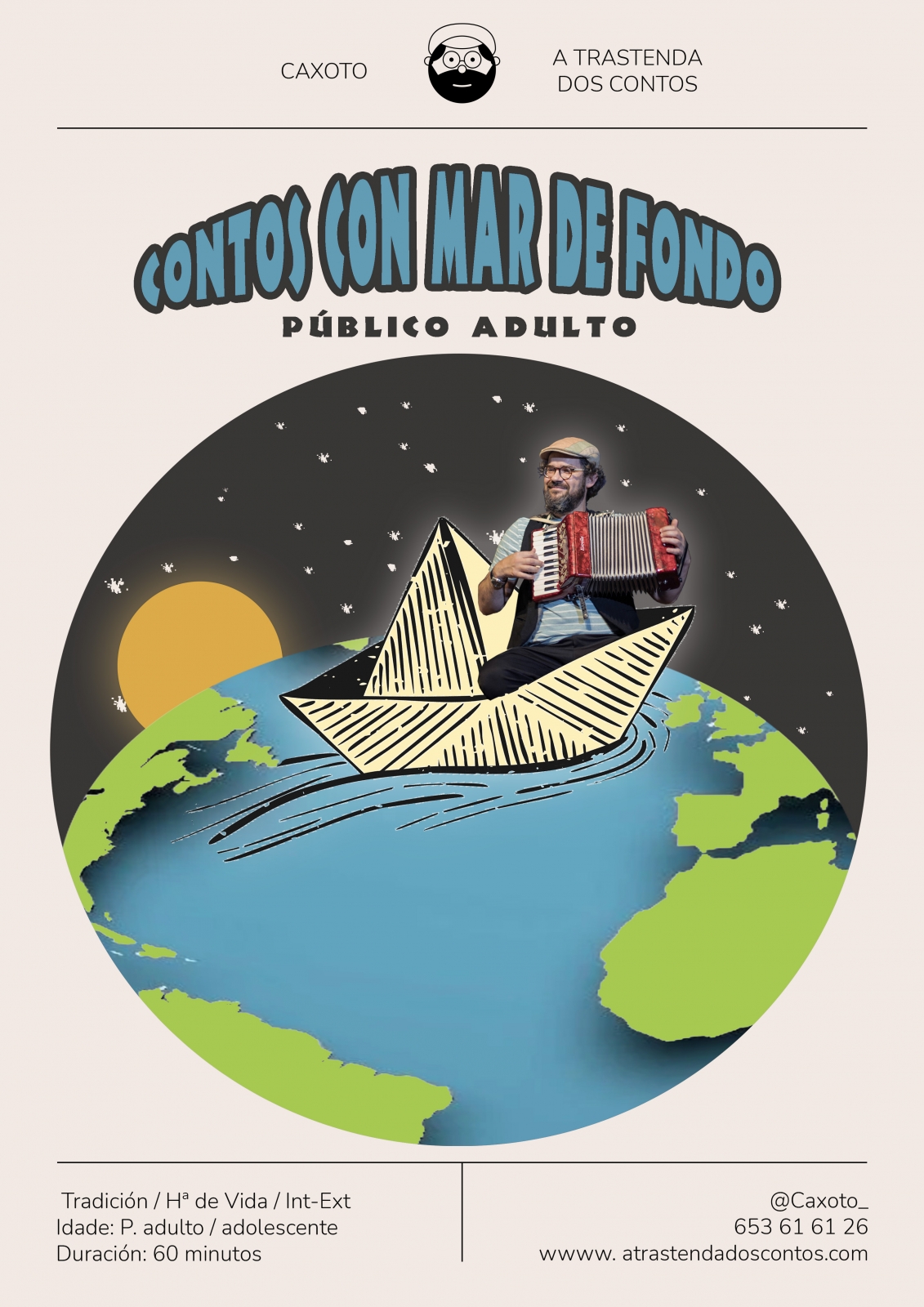 Ao longo da súa traxectoria como narrador oral Caxoto foi atesourando un rico repertorio mariñeiro de contos, lendas, anécdotas e feitos históricos que agora decidiu enfiar neste espectáculo de narración oral. Un espectáculo para os cinco sentidos cheo de salitre, mar picada e vento zoando.