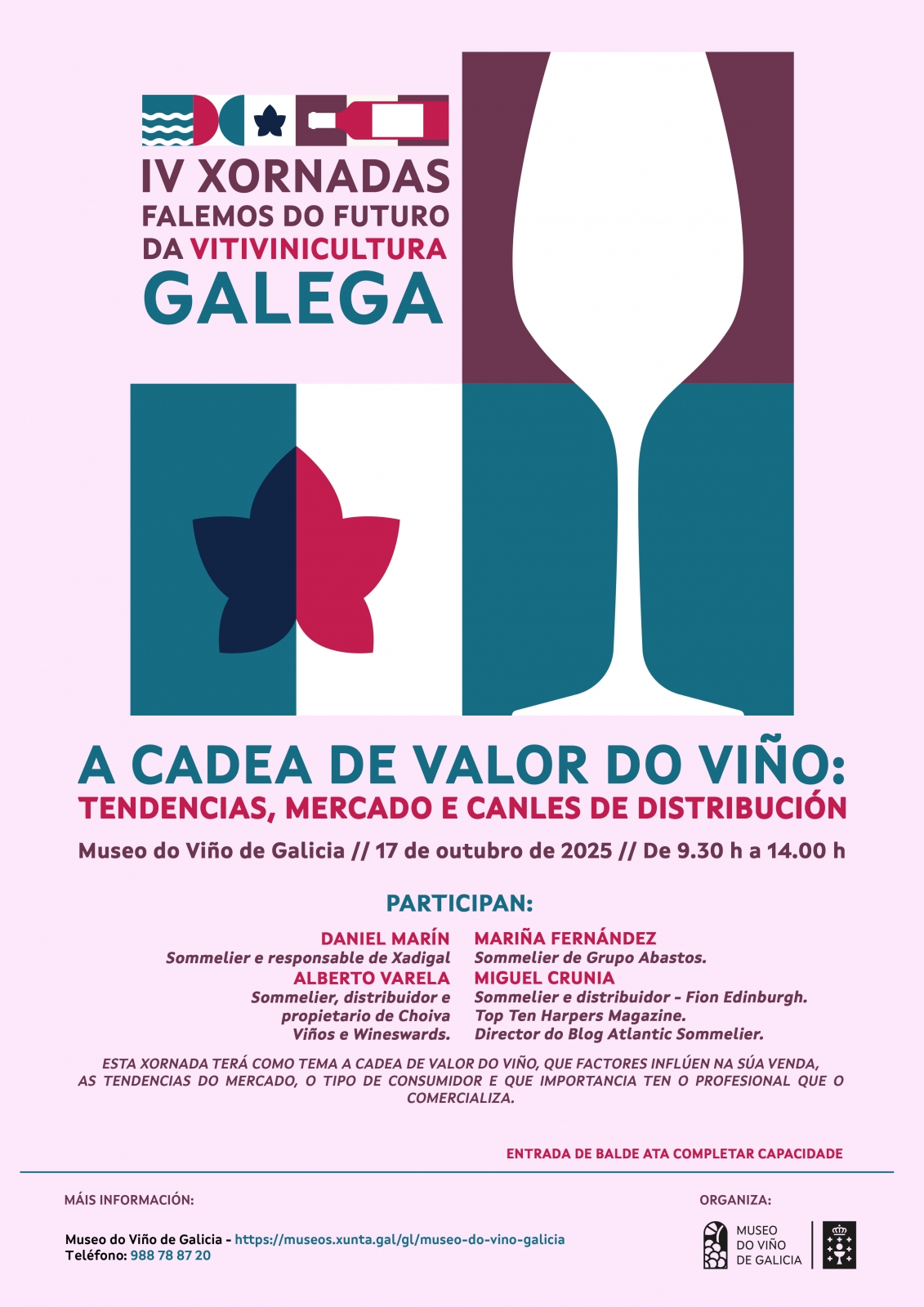 Esta xornada abordará o tema da cadea de valor do viño: os factores que inflúen na súa venda, as tendencias do mercado, o tipo de consumidor e a importancia do profesional que o comercializa. En definitiva, que responsabilidade ten cada parte e como chega ao consumidor, nun mercado cada vez máis cheo de referencias.