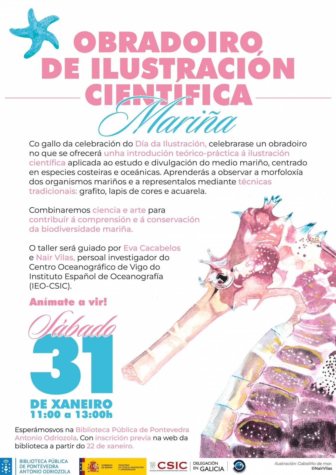 Co gallo da celebración do Día da Ilustración, celébrase un obradoiro no que se ofrecerá unha introdución teórico-práctica á ilustración científica aplicada ao estudo e divulgación do medio mariño, centrado en especies costeiras e oceánicas. Aprenderás a observar a morfoloxía dos organismos mariños e a representalos mediante técnicas tradicionais: grafito, lapis de cores e acuarela.
