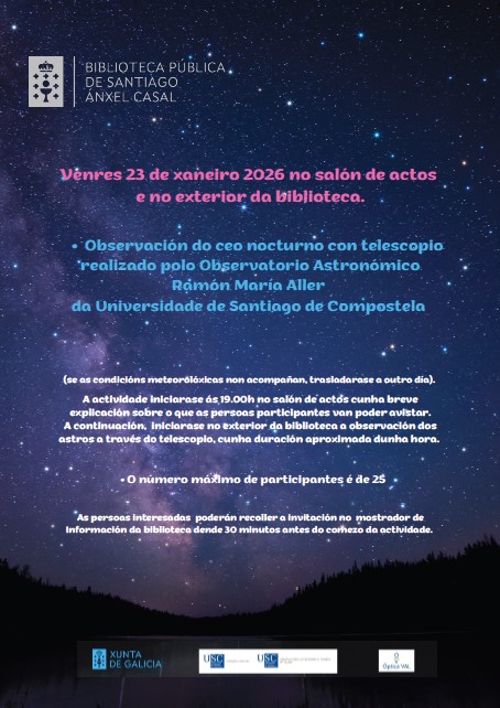 Observación do ceo nocturno con telescopio realizado polo Observatorio Astronómico Ramón María Aller da Universidade de Santiago de Compostela (se as condicións meteorolóxicas non acompañan, trasladarase a outro día). A actividade iniciarase ás 19.00h no salón de actos cunha breve explicación sobre o que as persoas participantes van poder avistar. A continuación, iniciarase no exterior da biblioteca a observación dos astros a través do telescopio, cunha duración aproximada dunha hora.