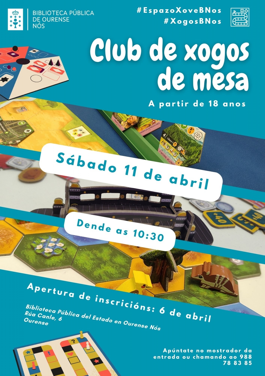 O sábado 11 de abril, a partir das 10:30, temos reunión aberta do club de xogos de mesa de adultos. Apúntate e pasa unha mañá divertida probando e aprendendo diversos xogos de mesa xunto a algúns dos integrantes do noso club regular.