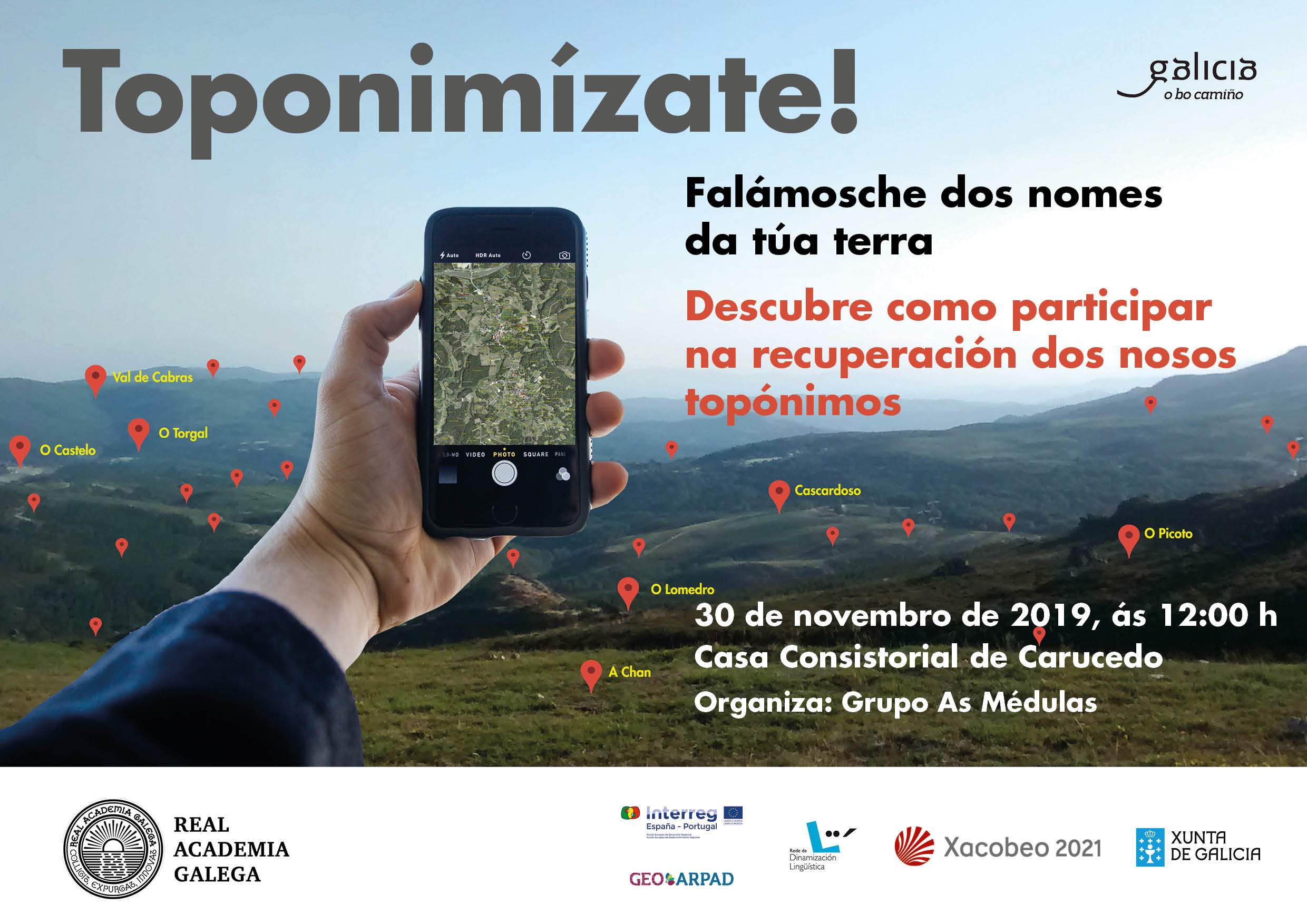 A acción enmárcase nos proxectos Toponimia de Galicia e GeoArpad, impulsados ambos os dous desde a Xunta de Galicia, e coordinarase desde a Real Academia Galega (RAG) en colaboración coa Secretaría Xeral de Política Lingüística. A toponimia é a disciplina que estuda os topónimos ou nomes propios de lugar: os das aldeas e parroquias, os dos ríos e leiras, os dos penedos e fontes. Constitúe un aspecto fundamental do noso patrimonio que liga a lingua propia coa xeografía, a historia ou a arqueoloxía de noso. Entre outubro e decembro de 2019 Toponimízate chegará a 15 concellos da Rede de Dinamización Lingüística: Noia, Mazaricos, Muxía, Ordes, Folgoso do Courel, Guitiriz, Taboada, Vilalba, Beariz, Manzaneda, Ribadavia, Cambados, Cerdedo-Cotobade, Lalín e Pazos de Borbén.