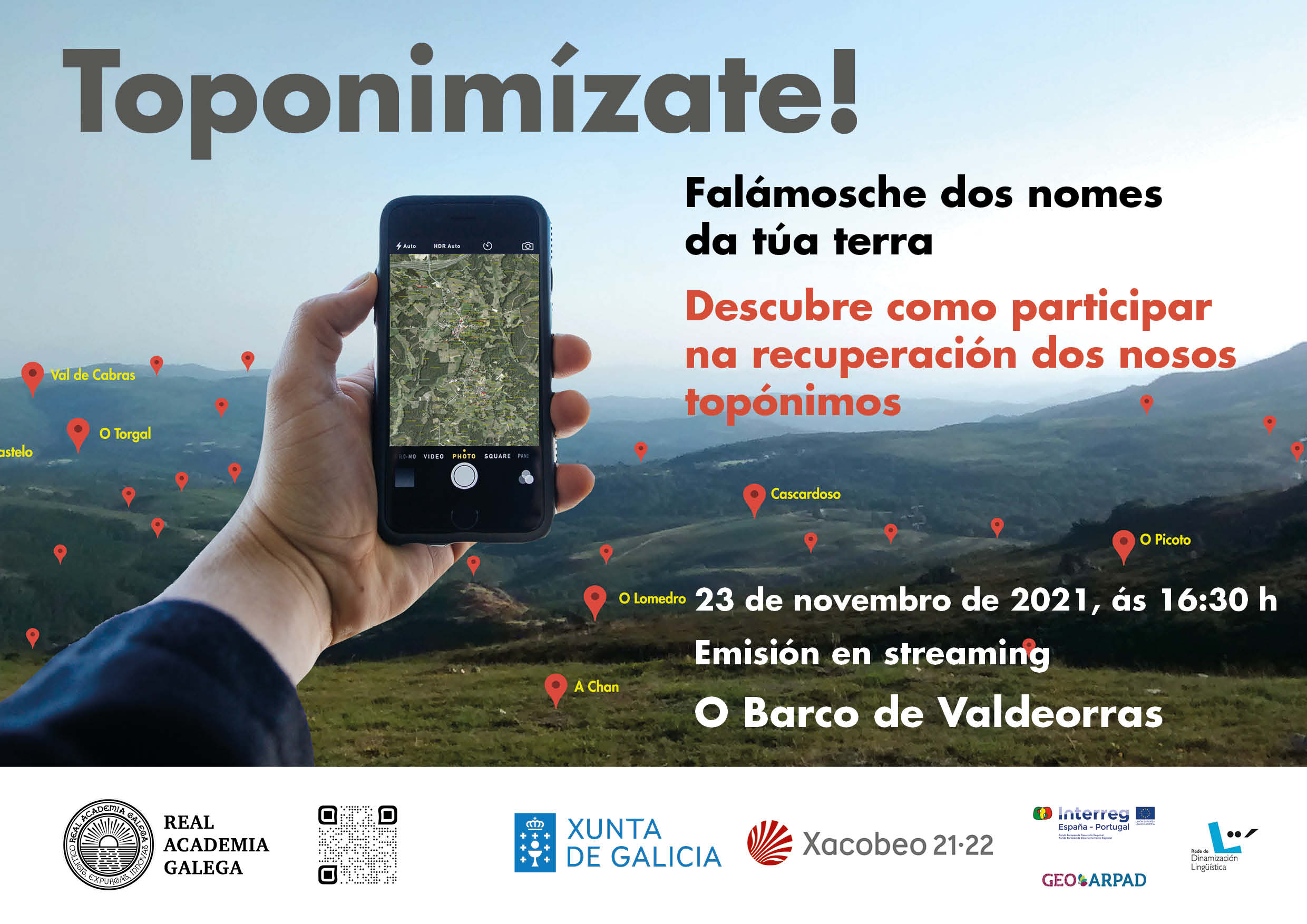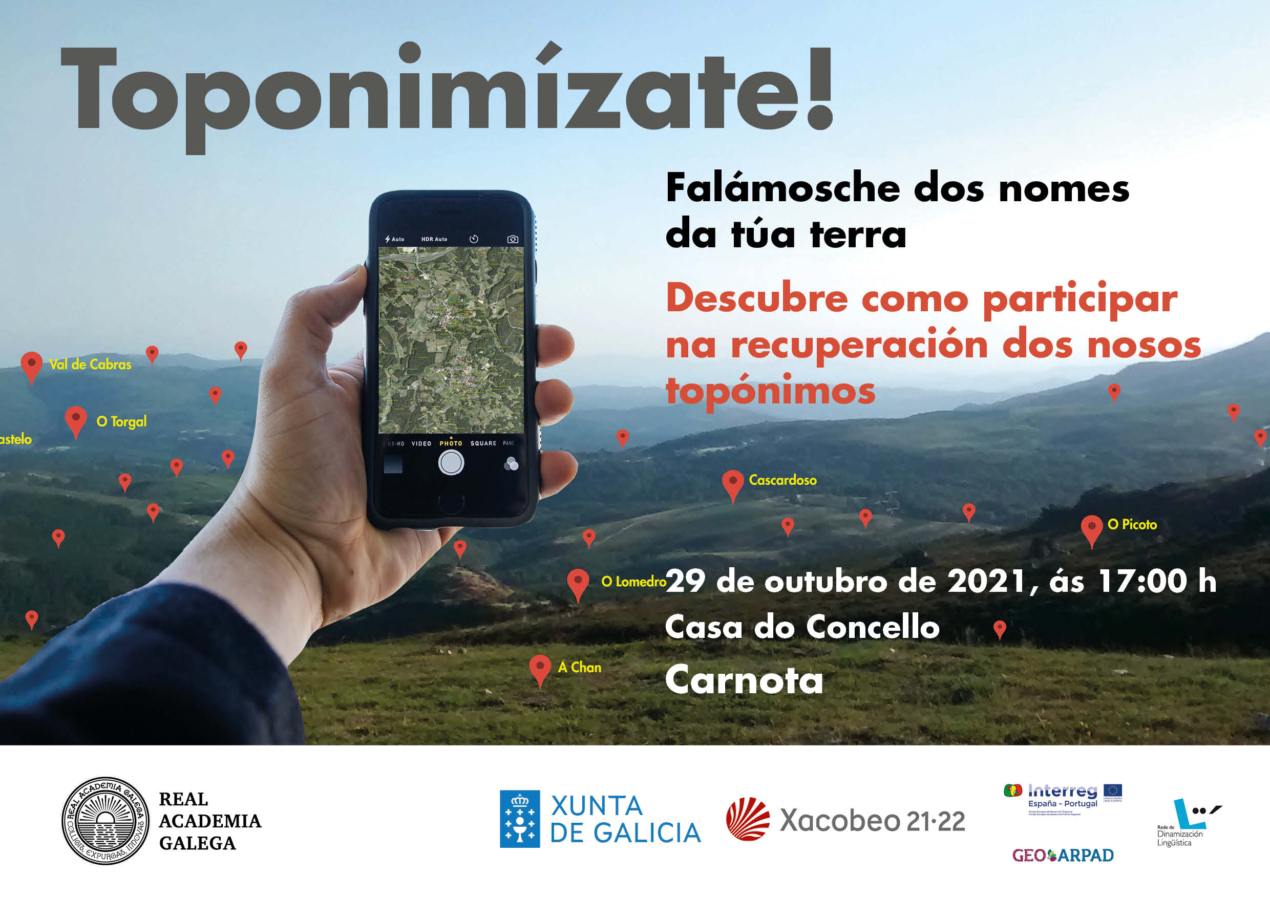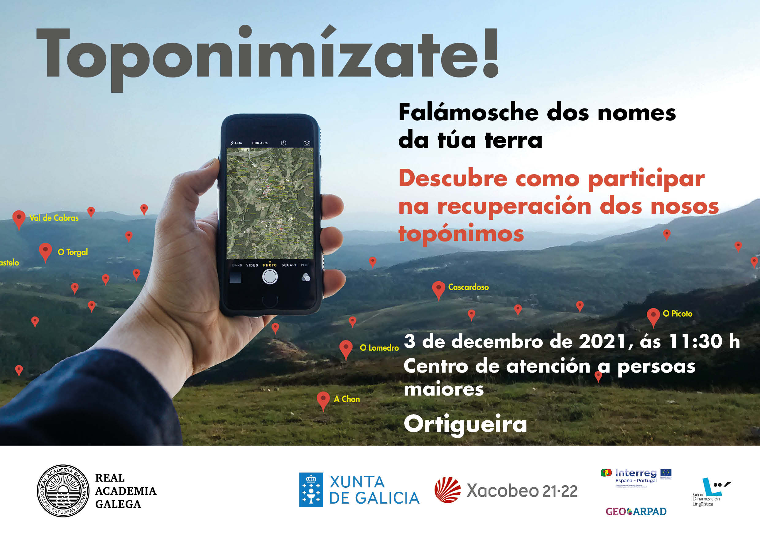 A acción enmárcase nos proxectos Toponimia de Galicia e GeoArpad, impulsados ambos os dous desde a Xunta de Galicia, e coordinarase desde a Real Academia Galega (RAG) en colaboración coa Secretaría Xeral de Política Lingüística. A toponimia é a disciplina que estuda os topónimos ou nomes propios de lugar: os das aldeas e parroquias, os dos ríos e leiras, os dos penedos e fontes. Constitúe un aspecto fundamental do noso patrimonio que liga a lingua propia coa xeografía, a historia ou a arqueoloxía de noso. Entre outubro e decembro de 2021 Toponimízate chegará a 9 concellos da Rede de Dinamización Lingüística: Ribeira, Carnota, Triacastela, Outeiro de Rei, O Barco de Valdeorras, O Irixo, Meaño, Marín e Ortigueira.